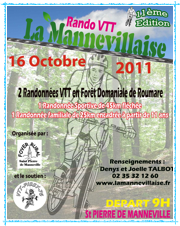 Randonnée VTT "La Mannevillaise" Le 16 octobre prochain aura lieu la 11ème édition de la randonnée VTT "La Mannevillaise" maintenant bien connue de tous. Deux randonnées "sportive" et "familiale" sont organisées. Inscriptions sur le site du Foyer Rural en cliquant sur : http://www.lamannevillaise.fr/Mannevillaise/Bienvenue.html |